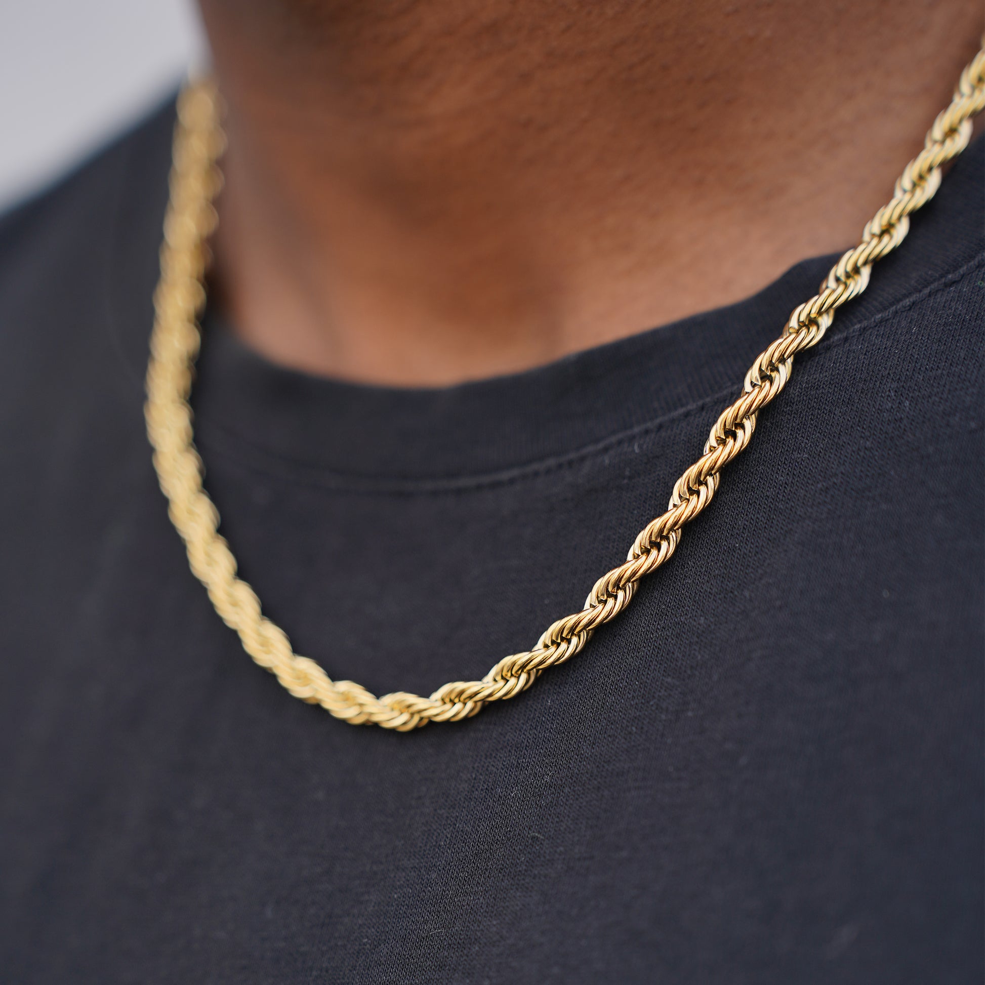 Make a statement with our bold rope chain necklace. This 5mm wide, 55cm long chain features a robust design that exudes confidence and strength.