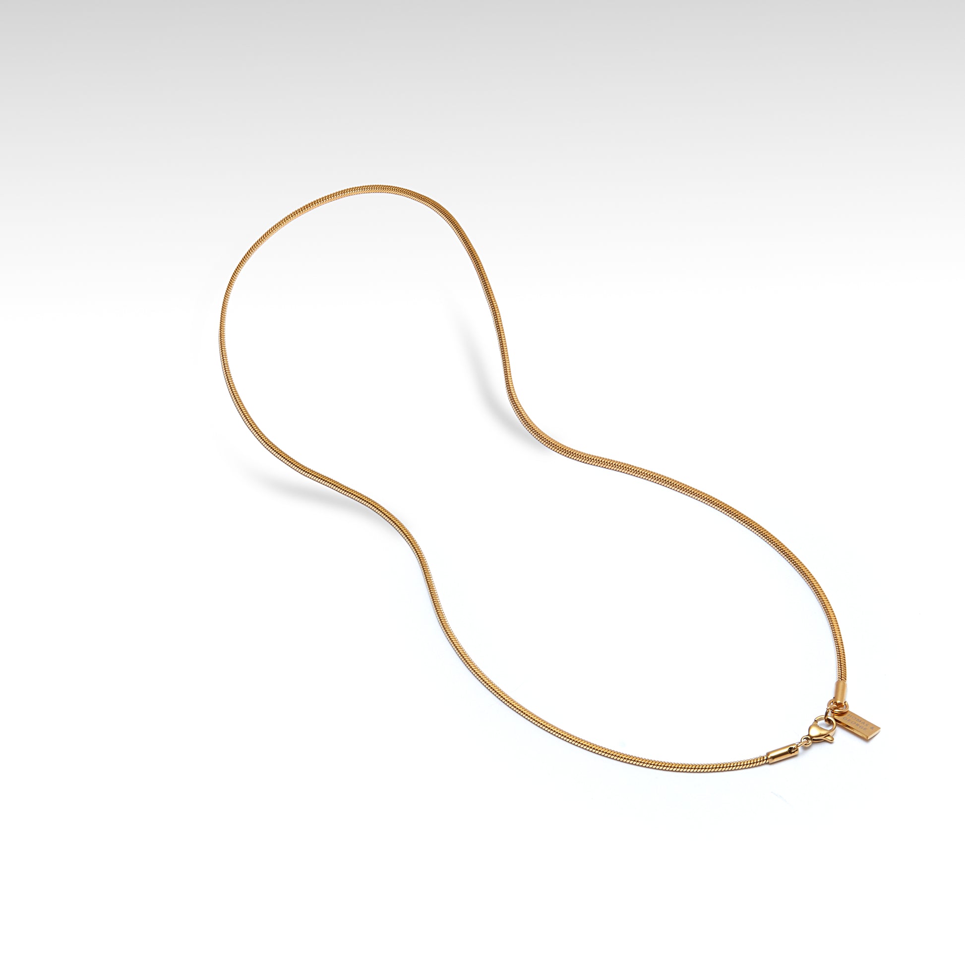 Our snake chain necklace has a 2mm width and a length of 55cm, making it a solid accessory.