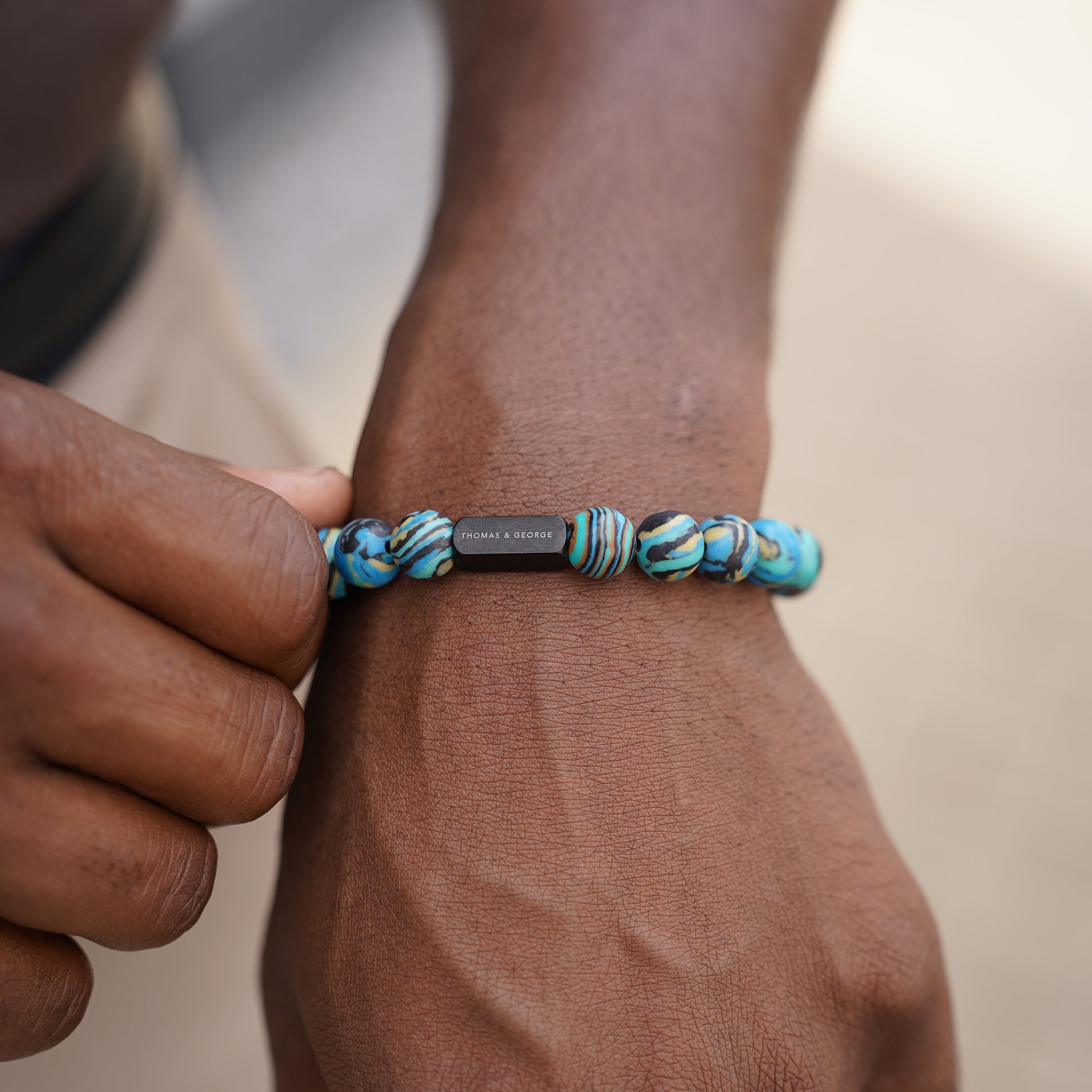 Each bead is meticulously chosen for its unique patterns and superior quality, ensuring a bracelet that’s as unique as you are. The sturdy elastic cord offers a comfortable, secure fit, perfect for all-day wear—whether you're elevating a casual outfit or adding a polished touch to formal attire. Embrace timeless craftsmanship and bold design with this versatile accessory from Thomas & George.