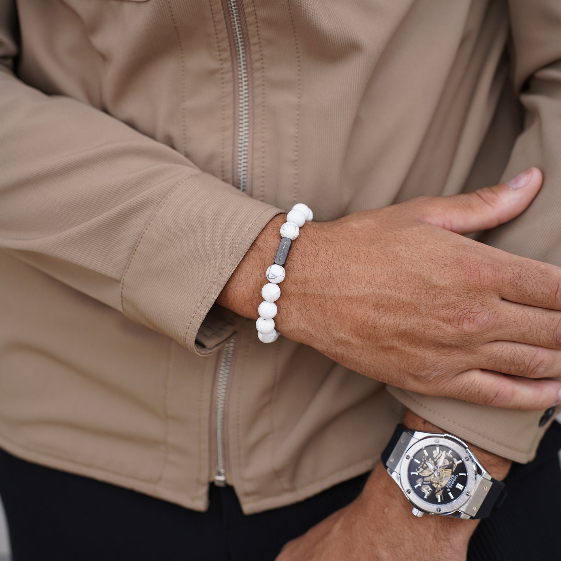Each bead is meticulously chosen for its unique patterns and superior quality, ensuring a bracelet that’s as unique as you are. The sturdy elastic cord offers a comfortable, secure fit, perfect for all-day wear—whether you're elevating a casual outfit or adding a polished touch to formal attire. Embrace timeless craftsmanship and bold design with this versatile accessory from Thomas & George.